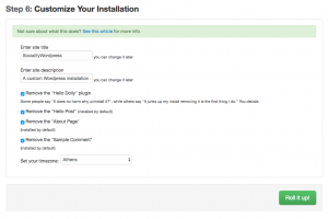 5. Τέλος επιλέγουμε πως θα ονομάσουμε την custom εγκατάσταση του WordPress που φτιάξαμε αφαιρούμε όποια plugin, post και σελίδες έρχονται με την απλή εγκατάσταση του WordPress και επιλέγουμε την ώρα.