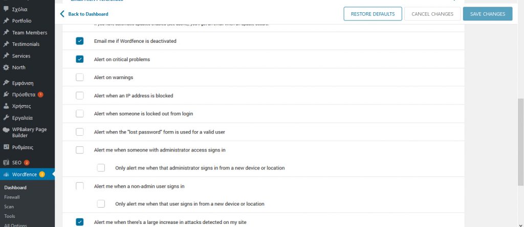 Εδώ από τη μάνα του τα έχει όλα και αν έχετε ένα site μπορείτε να τα έχετε κι εσείς αλλά εμείς που έχουμε πολλά κρατάμε μόνο τα σημαντικά δηλαδή When WF is deactivated, Critical Problems, When large increase of attacks