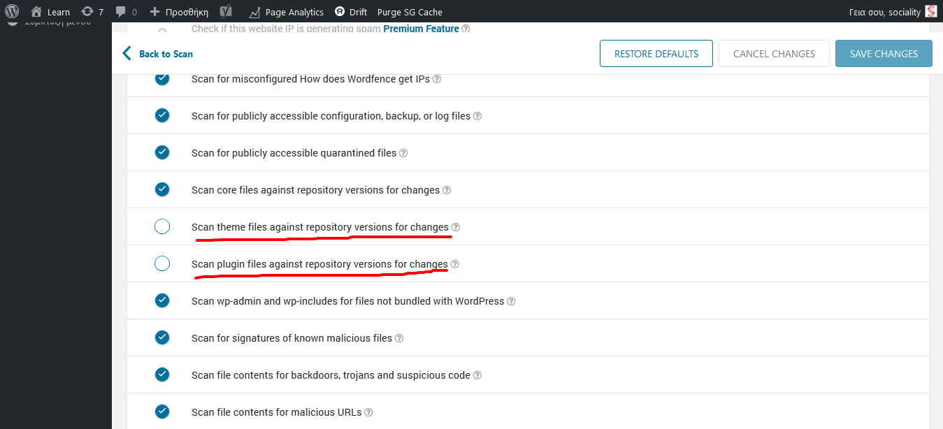 Έχει πολύ καλό Scan που δουλεύει και την αντιπαραβολή μεταξύ των αρχείων php του site σου με τα plugin στο repository και εντοπίζει οποιαδήποτε αλλαγή στο κώδικα. Έτσι εντοπίζει άμεσα οποιαδήποτε injection. Για να ενεργοποιήσετε το συγκεκριμένο feature πρέπει να το επιλέξετε στα scan options όπως φαίνεται στην εικόνα. Ενδεχομένως να θέλετε να τσεκάρετε να σκανάρει εκτός WP αρχεία στο τέλος αλλά δεν ξέρουμε πόσο χρήσιμα θα είναι τα αποτελέσματα.